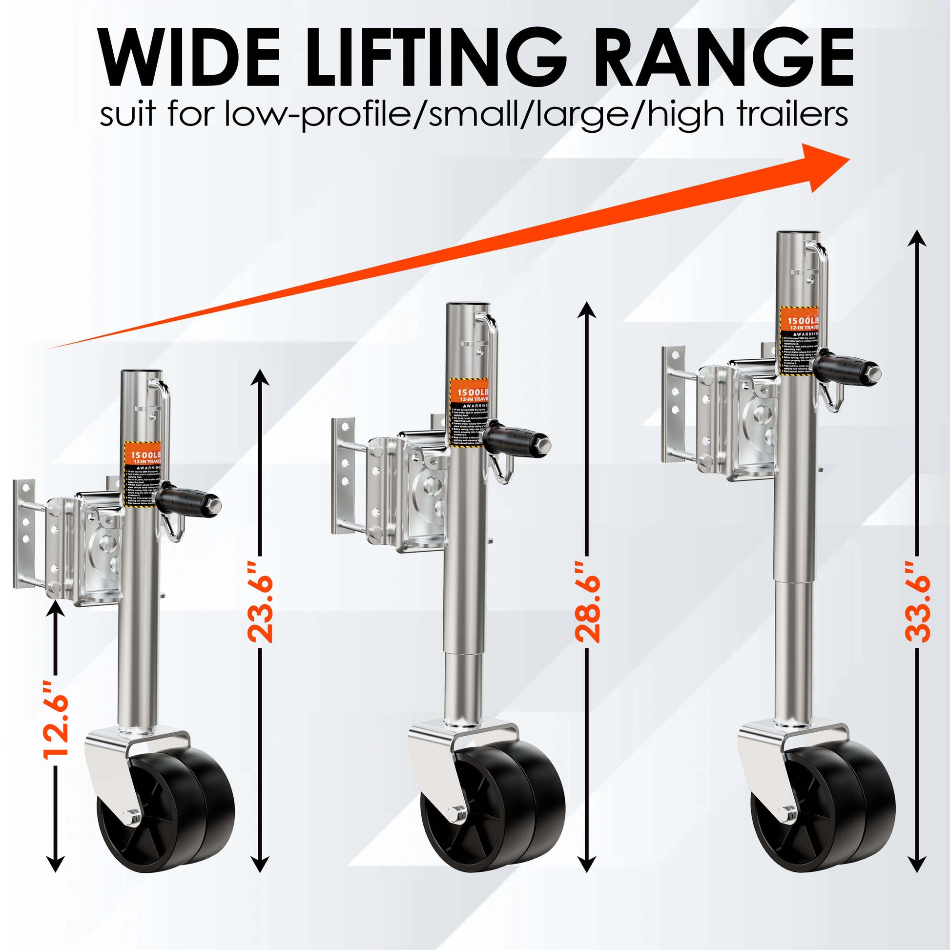 - Robust Lifting Capacity: Elevate your trailering experience with our trailer jack, boasting a robust lifting capacity of 1500 lbs; effortlessly adjust heights from 23.6 to 33.6 inches to accommodate trailer tongues ranging from 3" to 5"