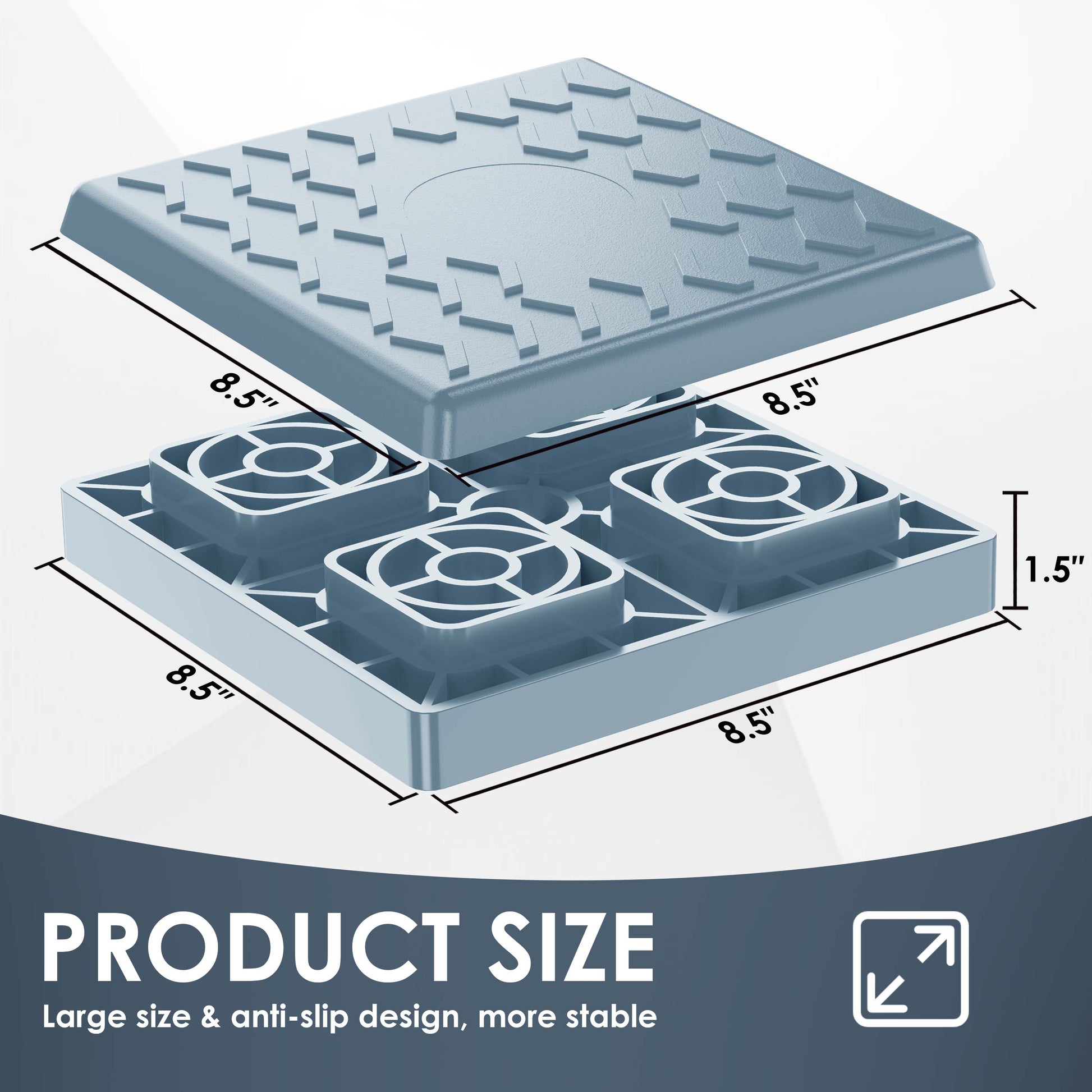 - 12 Pcs Leveling Blocks: Kit includes 10 leveling blocks & 2 top blocks and storage bag. Each Leveling Blocks measure 8.5" x 8.5" x 1.5", top Blocks measure 8.5" x 8.5" x 0.7".