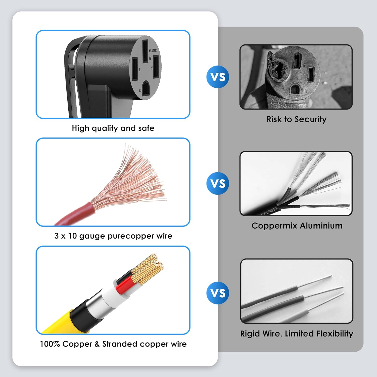 - Sturdy: 8 AWG pure copper cord with PVC in UL 62 standard for overheating resistance, and plug-in UL 817 standard; good conductivity, and more flexibility, especially flame retardant, heat, and UV resistance